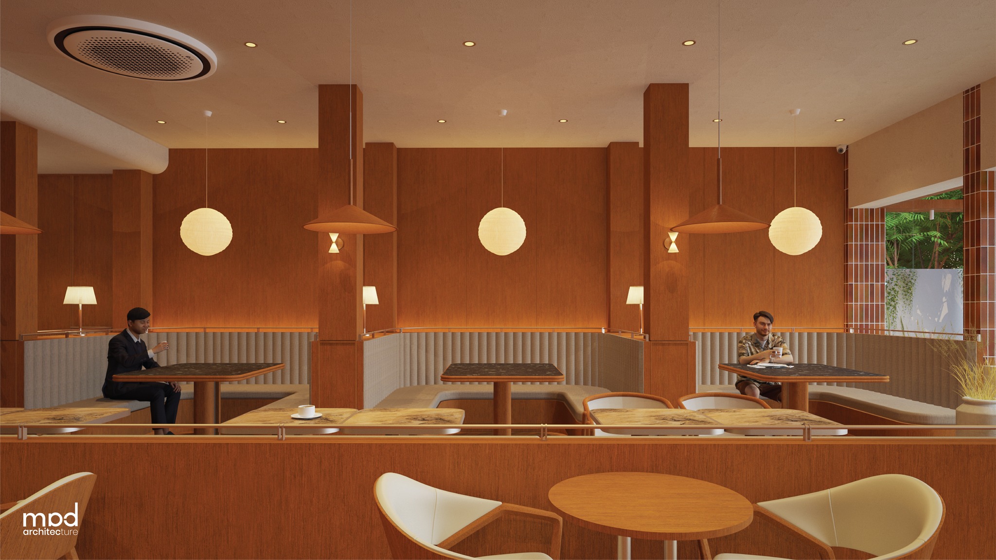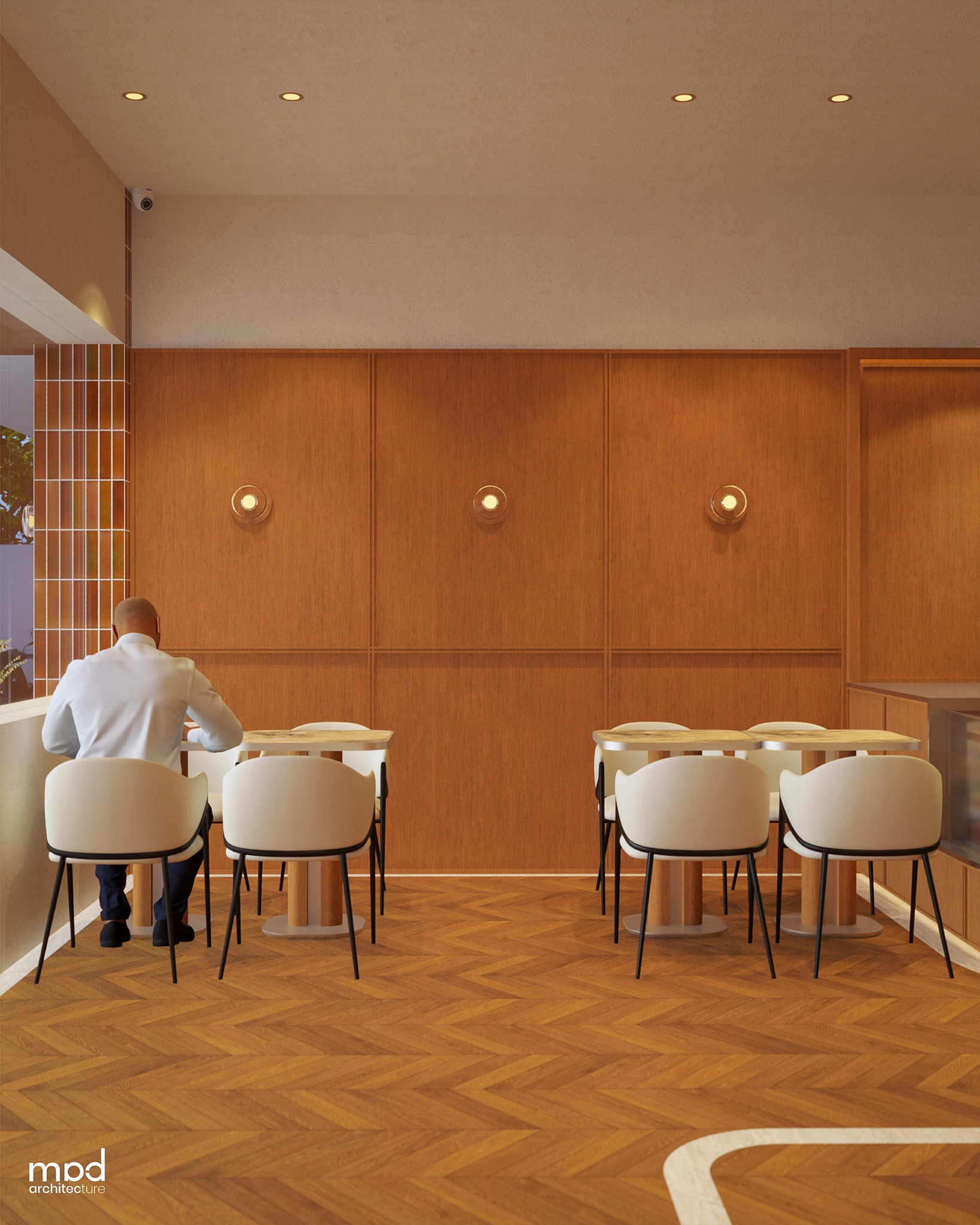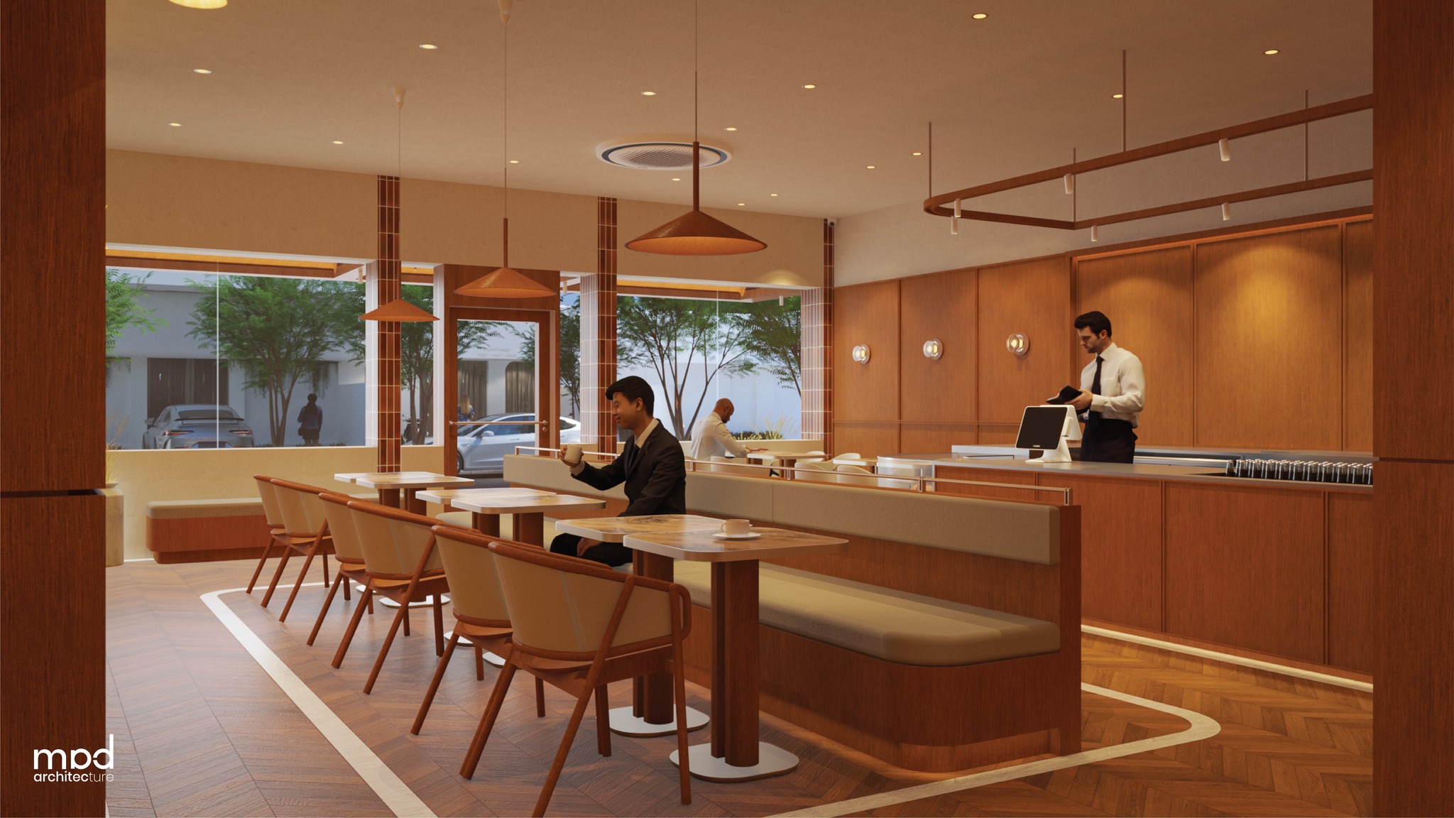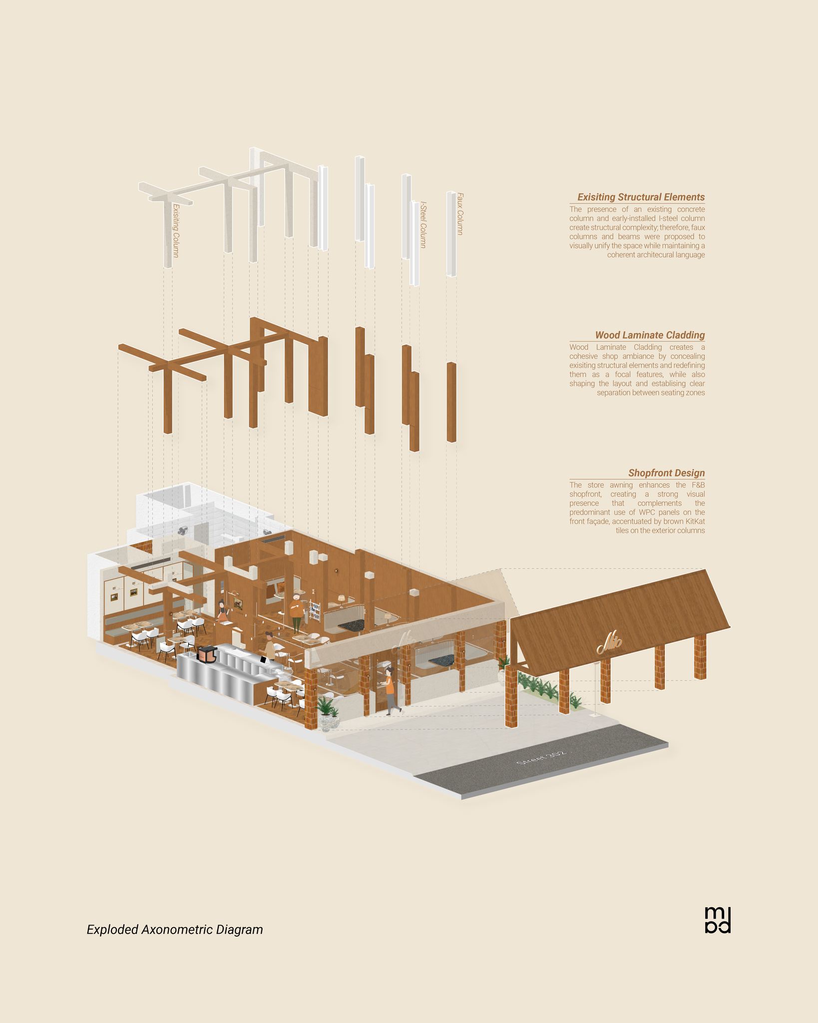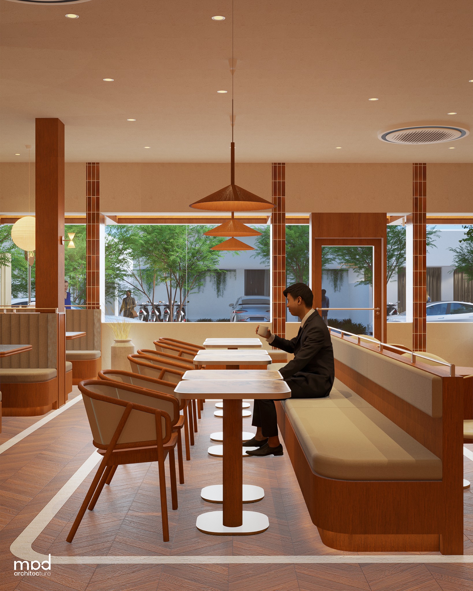 A wooden awning featuring the store logo defines the storefront, providing daytime shading while establishing a clear visual identity. The façade is articulated with glossy, mixed brown-hued subway-tiled columns and large operable glass openings that introduce natural light and strengthen the connection between interior spaces and the street. Inside, the seating configuration is carefully developed to accommodate diverse user groups, offering varied dining experiences within a unified layout. Seating is organized into distinct zones—group tables, family banquettes, and two-seater arrangements—shaped by existing site conditions, with faux columns and beams integrated to visually balance the space and harmonize surrounding structural elements. Responding to the fixed position of the I-steel column, the bar counter is positioned near the entrance to define a clear arrival point and promote smooth circulation throughout the layout.