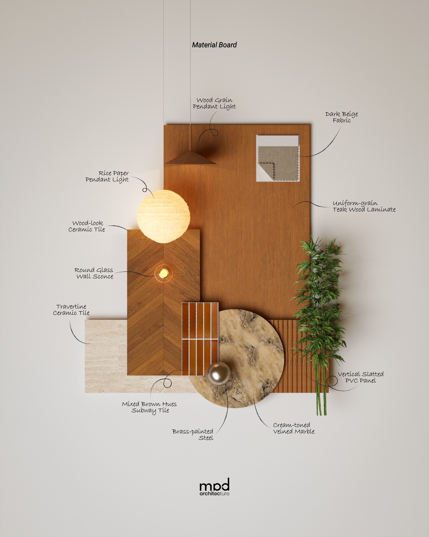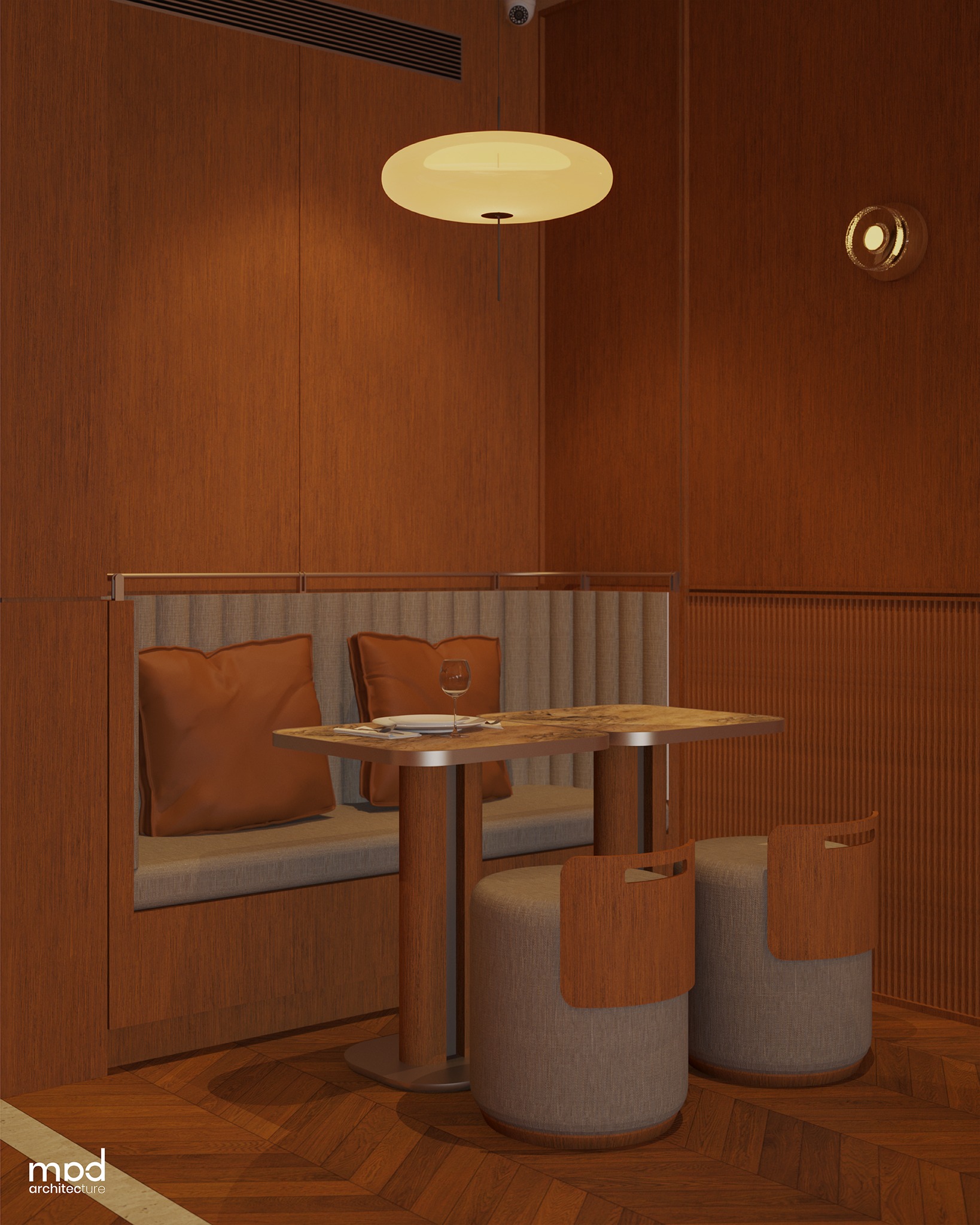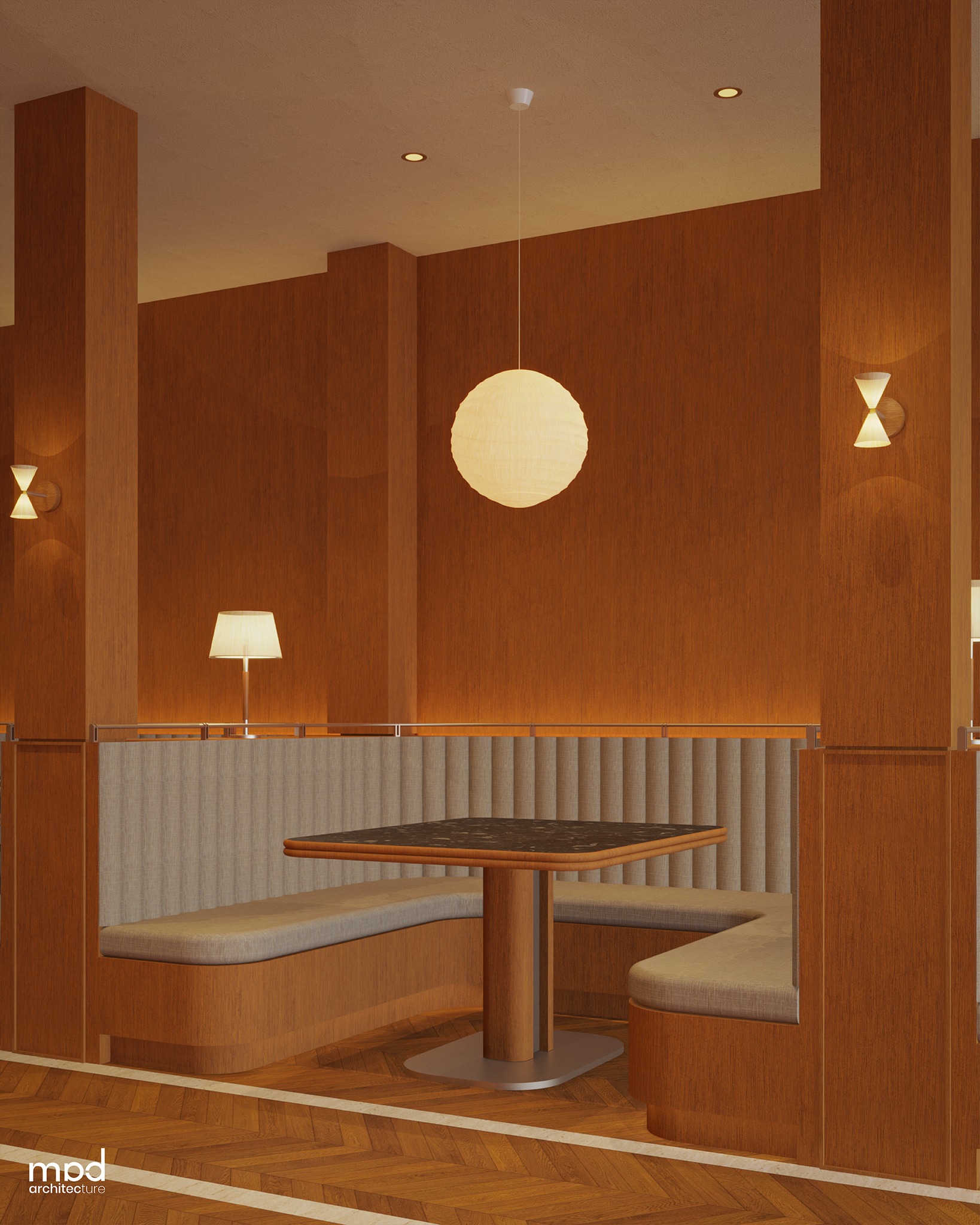 The overall spatial character is informed by a Japandi-inspired concept layered with contemporary eclectic influences, creating a refined yet approachable dining experience. Warm, medium-toned, uniform-grain teak wood laminate serves as the primary finish, featuring a fine-grain surface with subtle linear patterns expressed through exposed framing and delicate grooves that add depth and craftsmanship. Soft ambient lighting enhances material textures and surfaces, cultivating a calm and understated atmosphere conducive to both dining and social interaction. Custom-designed joinery—including tables, cabinetry, and customized family banquette seating—reinforces the consistent design language, contributing to a harmonious and well-integrated interior.